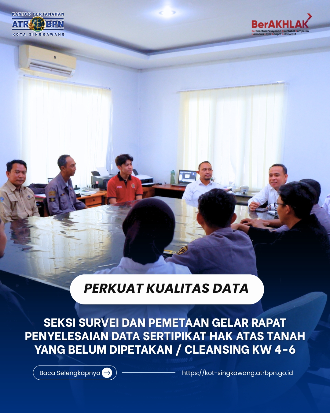 Singkawang – Pada Rabu, 22 April 2026, Seksi Survei dan Pemetaan Kantor Pertanahan Kota Singkawang melaksanakan Rapat membahas mengenai Penyelesaian data Sertipikat Hak Atas Tanah yang belum dipetakan / Cleansing KW 4,5 dan 6 yang dipimpin oleh Kepala Seksi Survei dan Pemetaan dan diikuti oleh Koordinator Kelompok Substansi Pengukuran dan Pemetaan Kadastral serta seluruh petugas ukur Kantah Kota Singkawang.